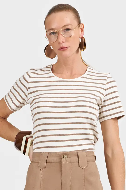 Blusa de Malha Canelada Listrada Feminina BM5517. Composição: 67% Liocel, 30% Poliester, 3% Elastano. Denim Italiano, Fatto in Brasile. Produto fabricado no Brasil.