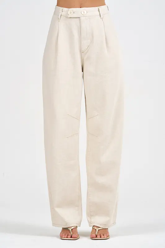 Calça em Sarja e Linho Barrel Julia Feminina CSM5613. Composição: 58% Algodão, 30% Viscose, 12% Linho.