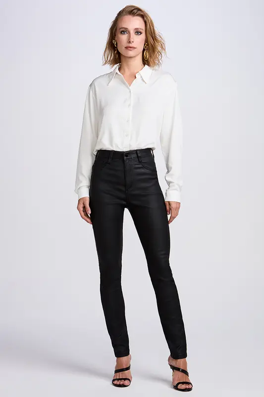 Calça Sarja Resinada Skinny Eleni Feminina CLE5249. Composição: 79% VISCOSE, 3% ELASTANO, 18% POLIAMIDA. A calça skinny Eleni se destaca dentro da categoria skinny por sua cintura mais alta, proporcionando um caimento ajustado e confortável. Possui pernas justas do quadril até a barra. Confeccionada em um tecido com efeito gloss, a peça apresenta um leve brilho e textura sofisticada. Denim Italiano, Fatto in Brasile. Produto fabricado no Brasil.