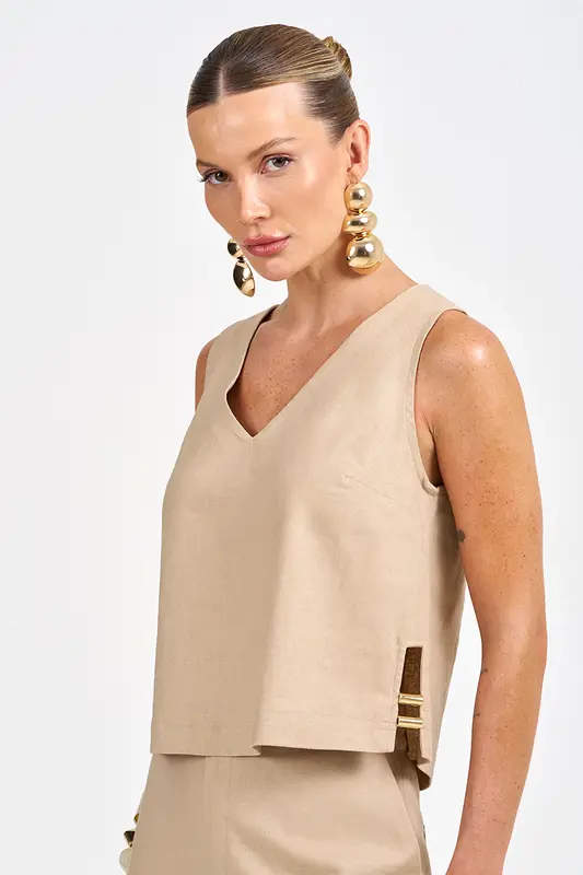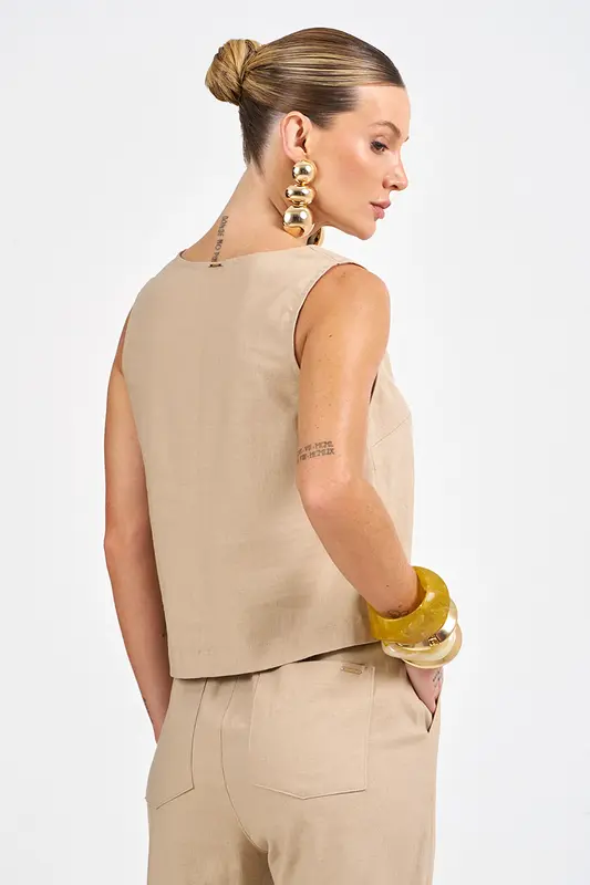 Regata de Linho Feminina RP5279. Composição: 69% Viscose, 28% Linho, 3% Elastano.